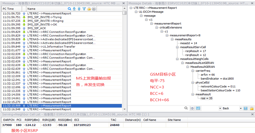 在无线环境满足切换条件情况下,UE只上报测量报告,未发生eSRVCC切换。