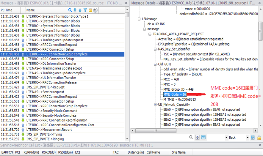 UE只上报测量,未发生切换问题,查看基站无相关告警,检查邻区无漏配,参数配置一致情况下,未切换问题还是存在。后续测试中,通过抓取核心网,eNB侧log分析,核心网侧查看eNB未发送handover command,通过多方面分析后,发现UE注册的MME code归属地属于厦门。UE注册到厦门MME,由于厦门MME未配置完整参数,导致无法执行eSRVCC切换。