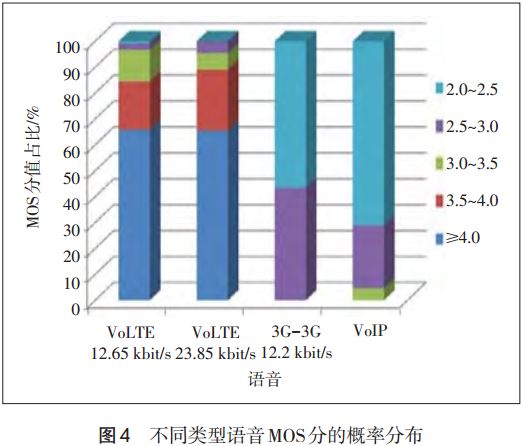 分别对VoLTE语音2种宽带编码速率、3G CS域语音(编解码为AMR-NB12.2kbit/s)、VoIP的微信电话本通过POLQA算法进行语音质量评估。从测试的结果上看,VoLTE呼叫的语音质量优于3G和OTT的语音呼叫。100个语音样本中,MOS分值在4分以上VoLTE占60%以上,3.5分以上VoLTE占80%以上,优于3G和OTT语音(见图4)。事实上,这几种情况通过人工的主观去听,能明显听出VoLTE语音更加清晰,声音失真更小。这是因为VoLTE语音比3G带宽更大,语音更清晰,且通过QoS保障,在时延、抖动、丢包率方面比同是IP语音的微信电话本更具有优势,获得的MOS分值更高。