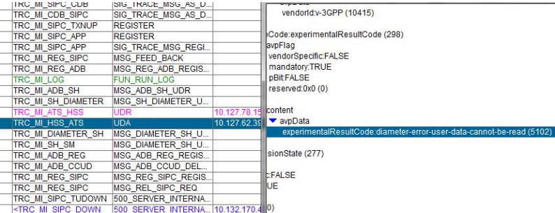 华为VoLTE AS(MMTEL AS)在第三方注册过程中通过UDR到爱立信HSS获取用户的信息,HSS返回的UDA消息diameter-error-user-data-cannot-be-read (5102),TAS返回500错误,第三方注册失败。