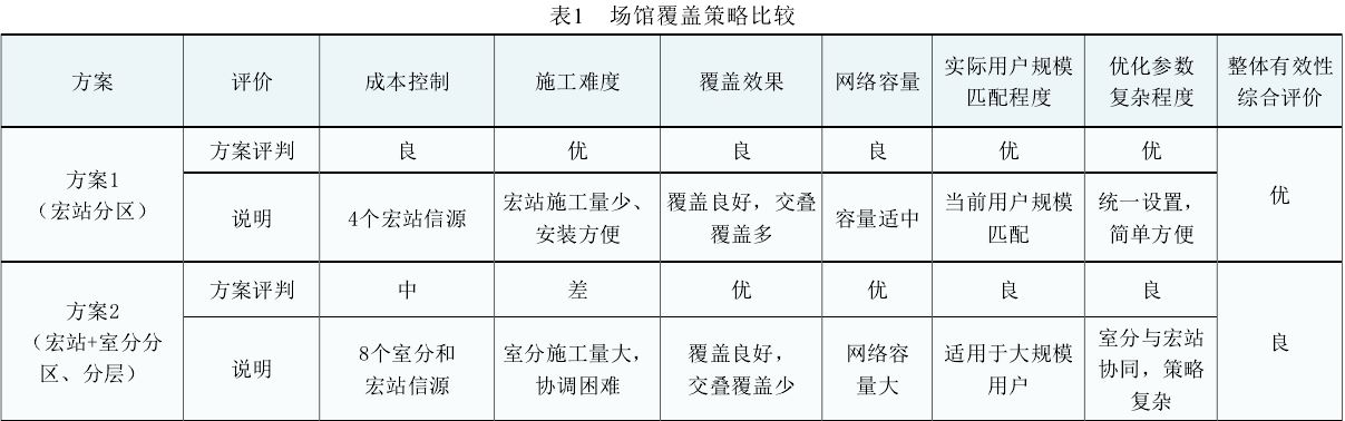 针对本文大型场馆的实际情况,通过从成本、施工难度、覆盖效果、容量、用户规模匹配、优化复杂度等几个方面进行比较,确认方案1最优,具体如表1。